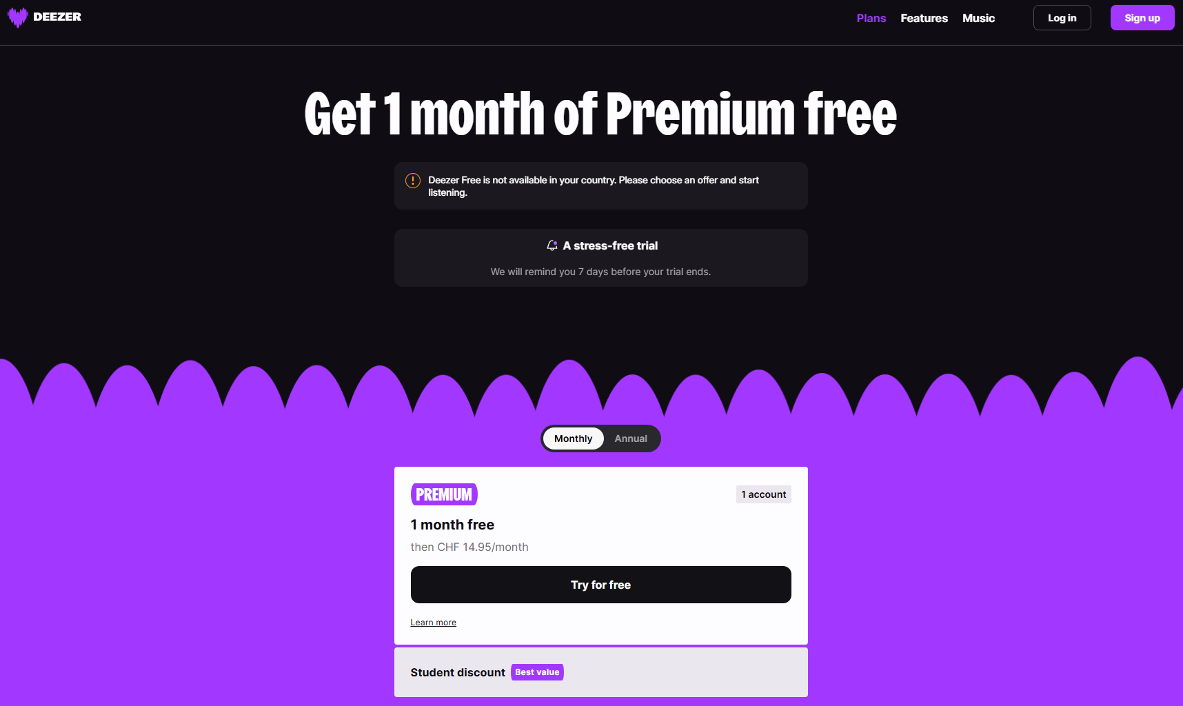 In der Schweiz ist keine kostenlose Nutzung von Deezer (mit Werbung) möglich. Entsprechend können Nutzer:innen nur ein Testabo abschliessen, welches sich nach 1 Monat kostenpflichtig und automatisch erneuert. Immerhin: 7 Tage vor dem Ende der kostenlosen Testperiode werden Nutzer:innen an die Verlängerung erinnert.