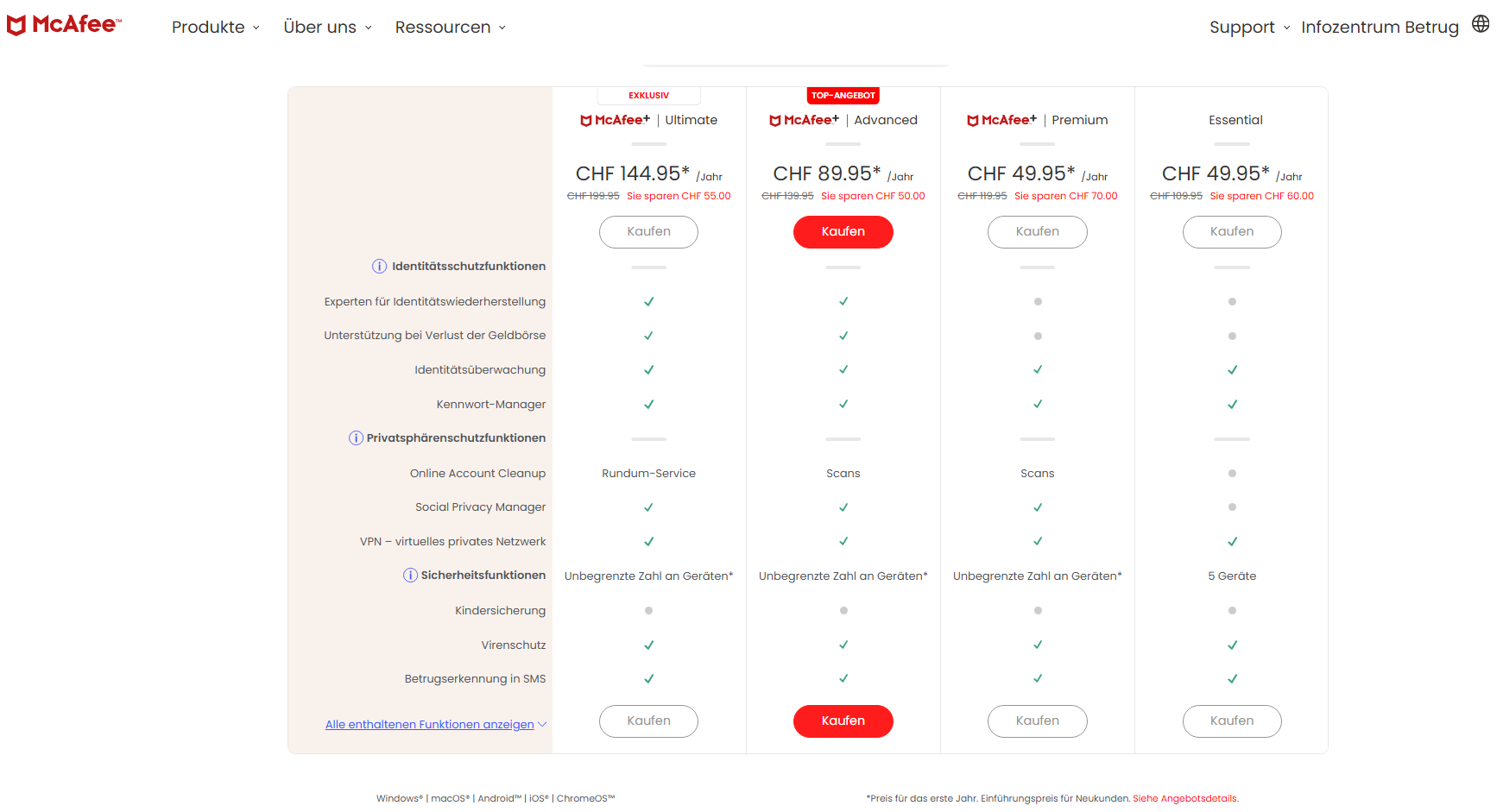 Bei der Produkteübersicht werden die Optionen Advanced und Ultimate besonders hervorgehoben. Bei Ultimate wird ein rotes EXKLUSIV angezeigt, bei Advanced ein rot hinterlegtes TOP-ANGEBOT. Bei der Option Advanced sind die Kaufen-Knöpfe rot eingefärbt, was bei den anderen Optionen nicht der Fall ist. Die Preisangaben bei sämtlichen Optionen sind irreführend – sie beziehen sich lediglich auf das erste Jahr des Abonnements. Danach wird das Abonnement automatisch zum vollen Preis (zwischen CHF 199.95 und CHF 109.95) verlängert, wenn Kund:innen nicht zuvor kündigen. Der entsprechende Hinweis befindet sich kleingedruckt am unteren Ende der Tabelle.