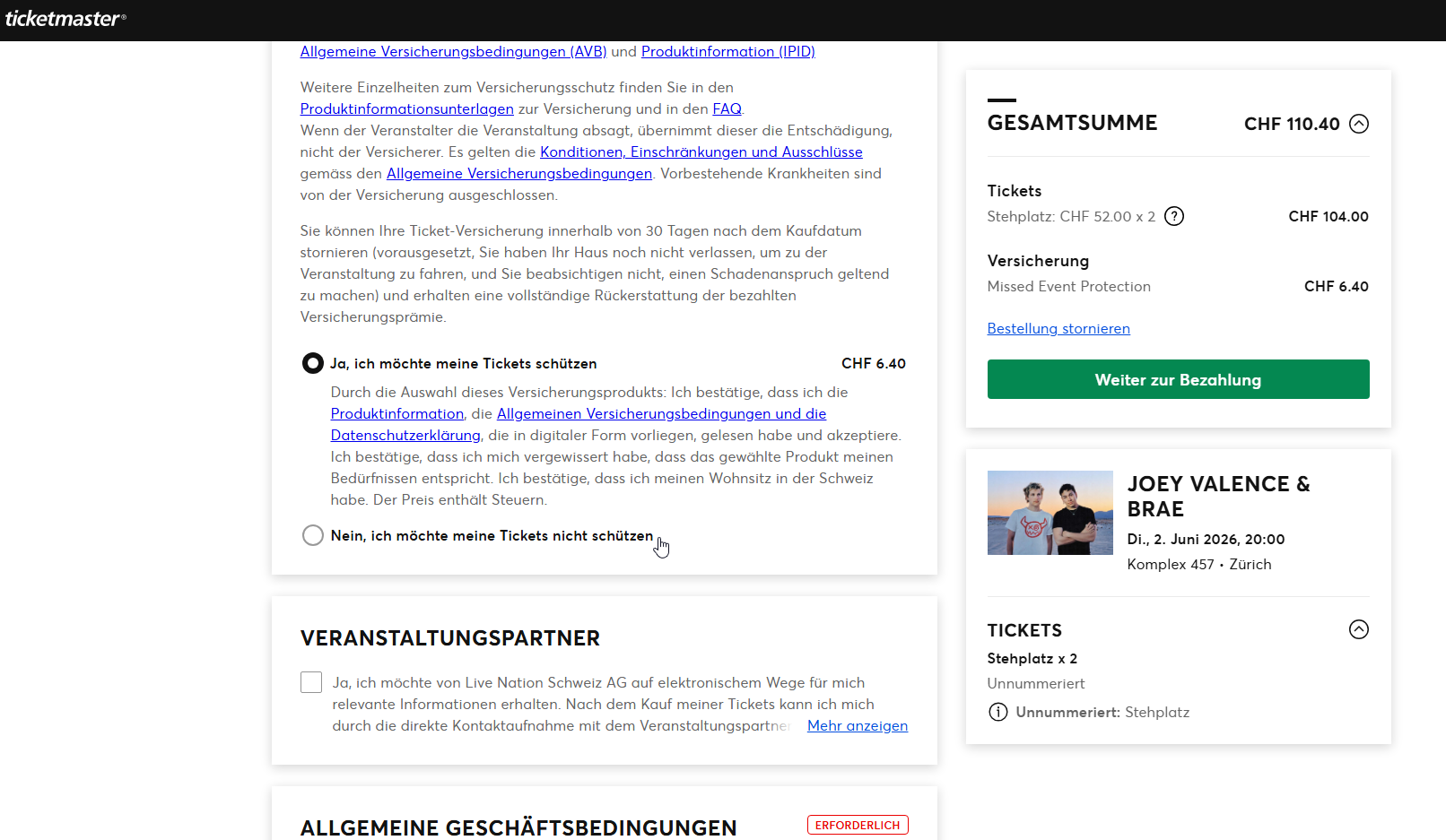 Beim Kauf von Tickets wird automatisch eine Ticketversicherung in den Warenkorb gelegt. Die vorausgewählte, kostenpflichtige Ticketversicherung muss von Konsument:innen aktiv abgewählt werden, damit sie nicht zu Zusatzkosten führt.