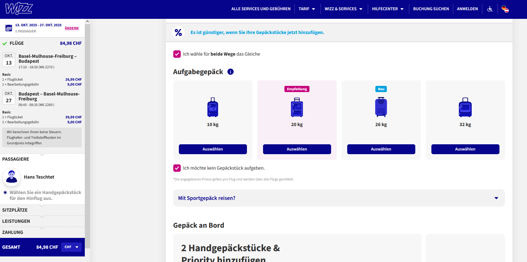 Beim Buchungsprozess von Wizz Air kann zusätzlich ein Aufgabegepäck ausgewählt werden. Dabei wird bei der Auswahlmöglichkeit der unterschiedlichen Optionen nur das Gewicht angezeigt, nicht aber der zugehörige Preis. Damit sehen Reisende die Preise für die Gepäckstücke erst nach erfolgter Auswahl und können die Optionen nicht zuvor gegeneinander abwägen.